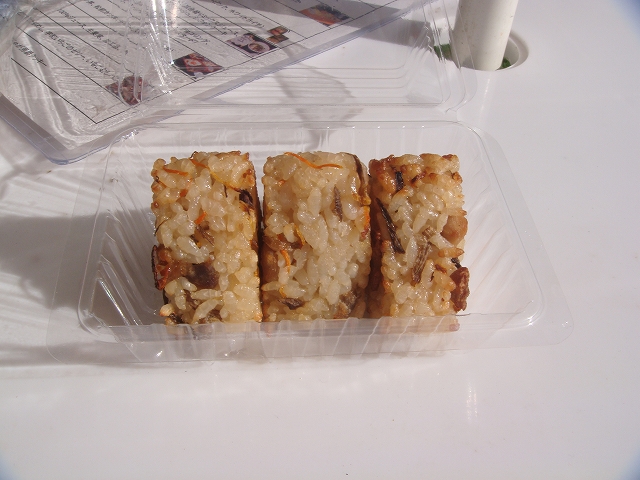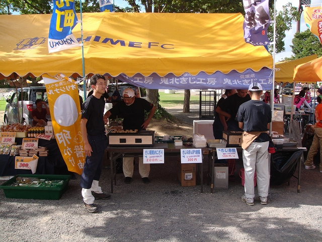 やっと16時頃になり、屋台からいい匂いがただよって来ました。もうすでに腹ペコでたまらずにウロウロし始める我々w「八幡浜(やわたはま)ちゃんぽん」の店にフラフラと近寄り、「すみません、ちゃんぽん何時頃できますか?」と聞いたり、きじ肉の屋台で焼いていたきじ肉入り焼きおにぎりを見て、「それ焼き上がったらすぐにください」と言ってみたり・・・。それを見かねたのかきじ肉のおじさんが、「じゃあちょっと味見してみてください」って1コくれたwwwおいしかった。