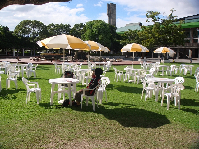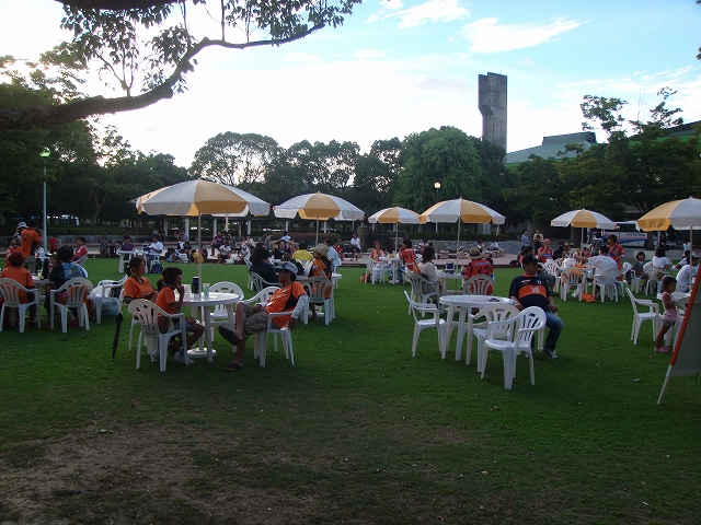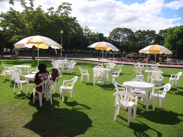 試合が終わって15時。そろそろ屋台開いてるかなー♪と思いましたが開いているどころかまだ準備すらしてなかった。15時じゃ早いか。テーブルとイスだけは用意されていたので、缶ビールを買ってひたすら待つ。缶ビールの店が開いていて本当によかったと思う。