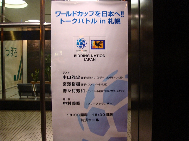 『「ワールドカップを日本へ!」トークバトルin札幌』に行く前に、この前このブログでご紹介した「開拓屋」で一杯飲んでから行きました。歩道に屋台を出していたわけではなく、店のドアをすべて取り外して、オープンカフェのようになってました。おいしそうにビールを飲む我々の姿を見て、歩道を行き交う夫婦の反応が、だんなさんの方は立ち止まったりゆっくり歩いたりして飲みたそうなオーラを発しているのに対し、奥さんの方がそれを気づかないフリして飲ませないぞオーラを発して通り過ぎるというのがほぼ100%であったのが印象的でしたw