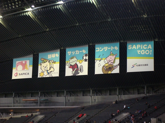 不在だったアウェー側の広告には、札幌市交通局がスポンサーになったようです。ここでサピカ宣伝してもJRと共通にするかバスも使えるようにしないと残念ながらダメだべなー。