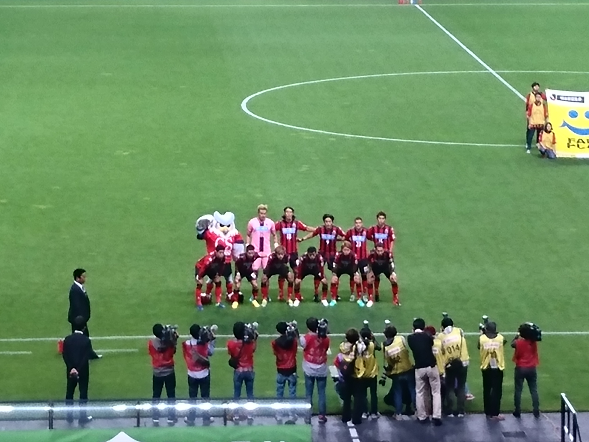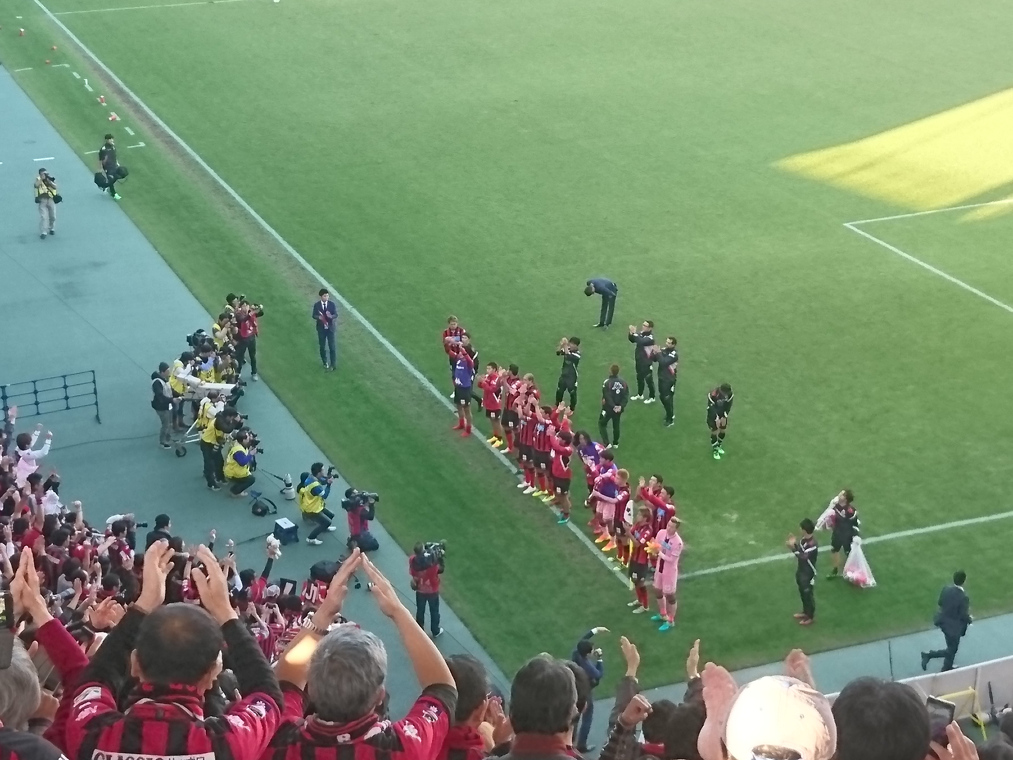 後半頭からうっちーが入って、そしてしばらくしてヘイスが入ってきてからやっと落ち着いてきた気がする。チャンスも徐々に多くなってきて、選手がこっちに近づいてくるたびに前にいるサポで試合が見えなくなって、立ったり座ったりする我々。そしてとっくんが相手にボール獲られそうになったところで前にいたオッサンが、「ん゛がぁぁぁんばれぇぇ」って叫んだところでFK獲得。我々ももう座っていられなくて立ち上がった。絶好の位置だったし。そしたらほんとに目の前でとっくんが決めてくれた!!オッサンの魂の叫びが同点弾を呼んだのだwww