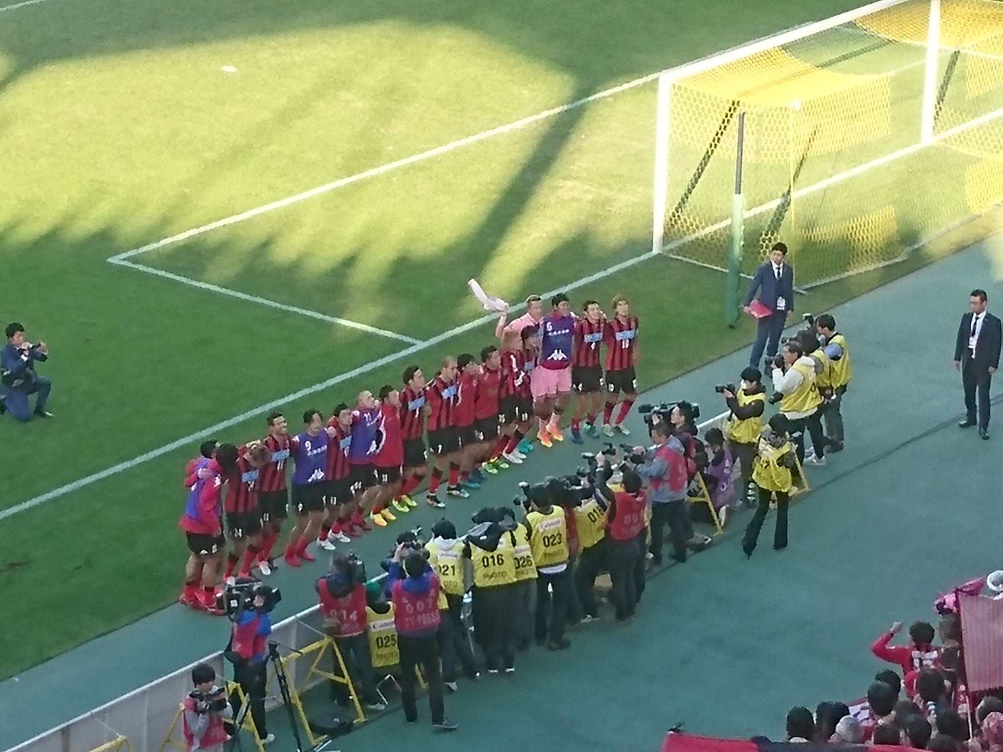 試合が終わって興奮冷めやらぬ中、いま自分がいるこの貴重な時間に、選手のいろんな姿を目に焼き付けておかなくては、と思いました。ジュリーニョは裾をまくって顔を覆って、腹出して泣いてたwとっくんはとても怖い顔をしてまだゴール裏を煽っていた。もう試合終わったのにwそして向こうでは石井くんがブルーノさんと熱い抱擁を交わしていた。07年の昇格時は選手どうしだった2人がそうしているのを見ると、何だかすごく泣けた。