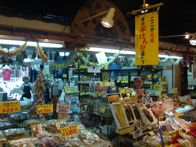 高知城をあとにして、前日に行った「ひろめ市場」へおみやげを買いに行く。ひろめ市場には食事処だけじゃなく、魚屋さんや肉屋さんや日用品のお店なども入っています。ここでおみやげに「芋けんぴ」を購入。いろんな味のがあって、お店の方がほとんど全部味見させてくれましたよ。