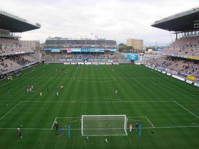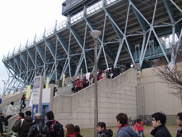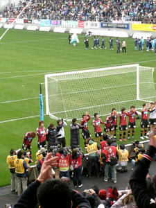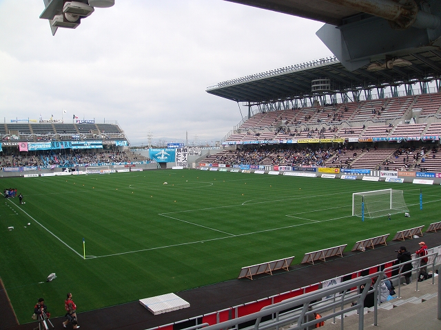 いいスタジアムだっただけに、少し残念だったことがいくつか。まず一つめは、せっかく立派な大型ビジョンがあるのに、場内でやっているイベントを映し出すことが一切なかった(私が見る限りですが)こと。ちびっこたちの前座試合や、えらい人たちの始球式などの放映はありませんでした。もう一つは、スタジアム内のPAが悪く(バクスタの上の一か所しかない?)音響が良くなくて場内アナウンスがよく聞こえなかった。まぁこれは、アエー側から時計を見られないことと同様に、アエーの洗礼という意味なのかもしれませんがw