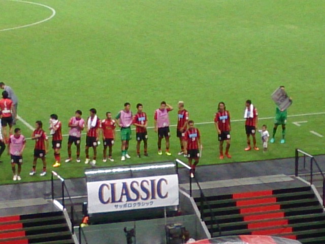 うちらが座った席の近くに、いま話題沸騰中のマセードJrがいたんですよ。なんかうしろで「コーンサドーレ!!」って小っちゃい子がウチのフラッグ振り回してがんばってるなと思ったら。ゴル裏のパパのコールの時も一緒に合わせて「ディエゴ!マセード!ディエゴマセド!」とかジャンプしながらがんばってるのwwwもう天使ですよ天使。あとドーレくんのことも大好きみたい。客席に入ってきたドーレくんをいち早く発見して指さして「ドゥォーレクゥーン!!」とか言ってたwお姉ちゃんに手をつないでもらってドーレくんの近くまで行ってガシッとドーレくんに抱きついて写真撮って、その後もなかなか離れようとしなかったよw