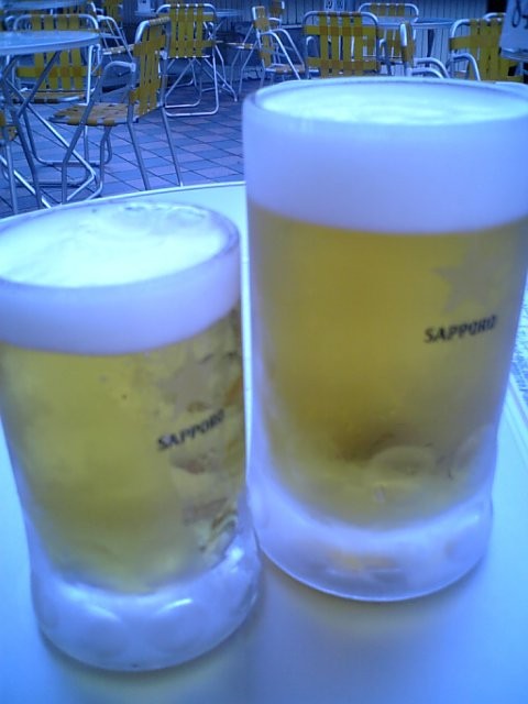 昨日は会社帰りに大通公園の盆踊りを見に行ってきました。もう17日だし盆踊りなんてやってないだろって思ってたんだけど、うちの人が「念のためにやってるかどうか見に行きたい」って言うもんで、半信半疑で行ってみたらやぐらが立っていた。そのへんに貼ってあった「さっぽろ夏まつり」のポスターを見ると、20日までやってるのね。生まれてこの方ずっと札幌にいるが、全然知らなかったよ。ところで盆踊りは18時半からとの事だったので、テレビ塔のふもとで時間つぶしにコレを。・・・大ジョッキデカすぎw