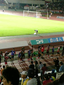 それにしても、クライトンのプレーはやっぱりレベルが違う。何であんなにボール取られないんだろうと思う。あそこでためが作れるからみんな楽だったろうな。選手のみなさんにおかれましてはぜひ見習っておくれ~。あと、後半開始早々宮澤くんがジャーンにボカーンと顔をやられて(あれはちょっとウケた)、クライトンがPKを蹴ろうとしてる時にジャーンが相手GKにしきりに耳打ちをしていたんだけど、その横でクライトンが涼しい顔してゴールマウスを見てたのがちょっとおもしろかったですwでも結構危なかったけどなwww