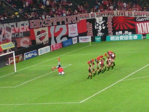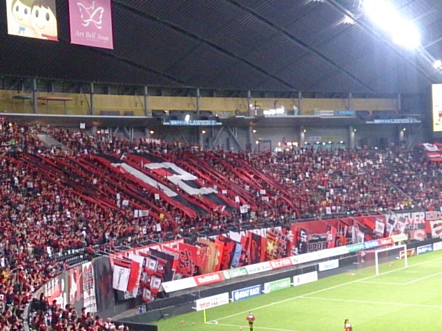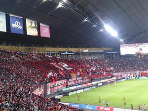 昨日は平日のナイトゲームということで、普段は赤黒なバックスタンドも仕事帰りのワイシャツ姿で白が多かったですね。上司に連れられて来たり、同僚のサポに誘われて来たりして、昨日が初めての観戦の人もいたのかな。試合も勝ったししかも逆転勝ちだし、いい終わり方して良かったなー。
