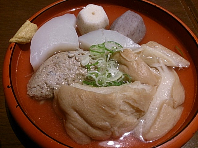金沢はおでんもおいしいということで、駅に戻ってきておでんも食べました。車麩(麩も金沢名物)、こんにゃく、大根、こいもをチョイス。だしが関西風でおいしいです。