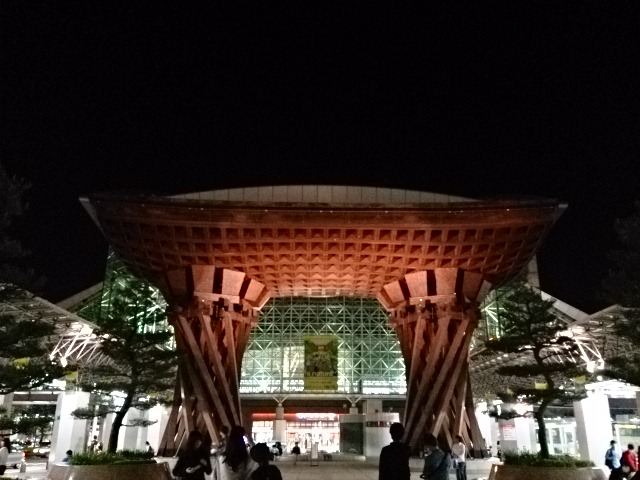 スケールの大きい、夜の金沢駅。大きすぎて写真に入りきらない。