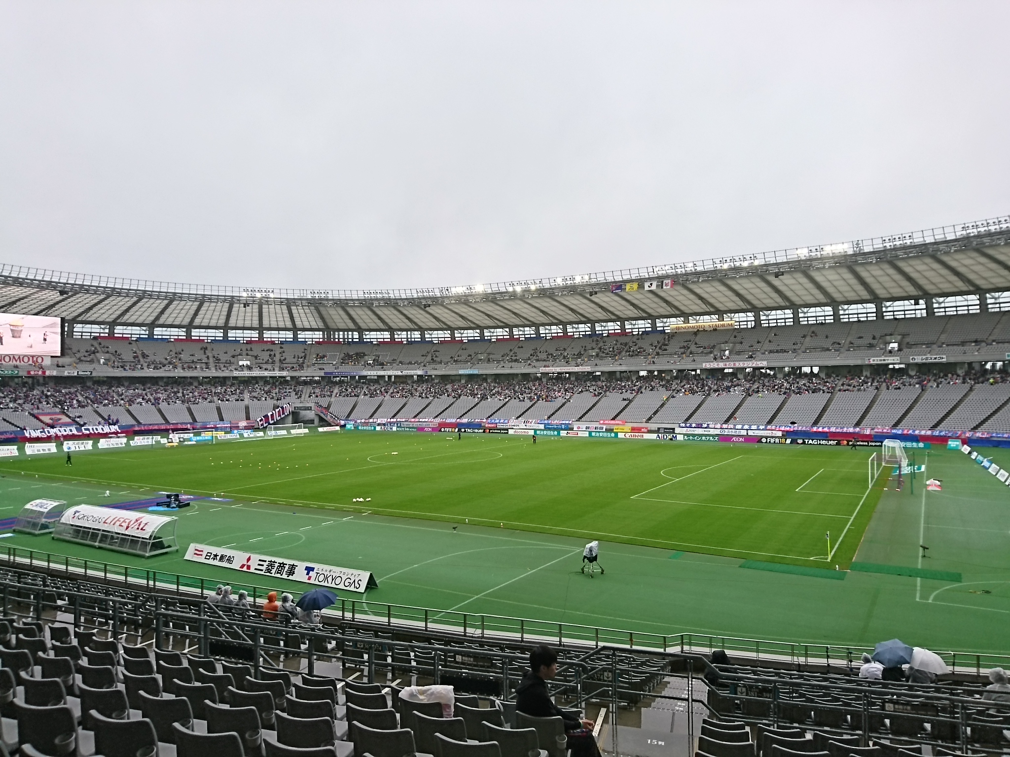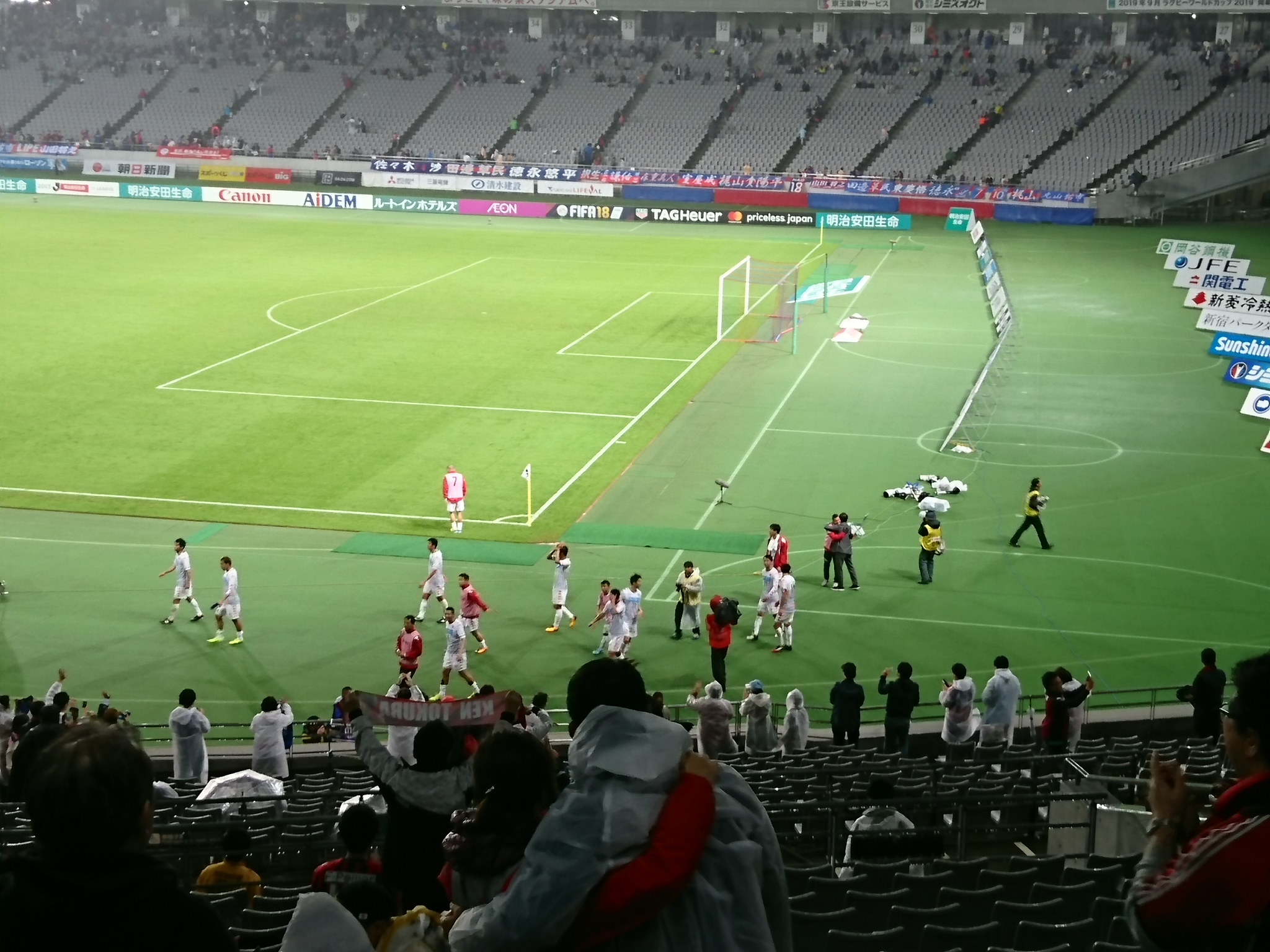 それでも途中から入った稲本や終了間際に入った河合が試合を締めてくれて2-1で無事試合終了。守備する人が守備して、点を取る人が点取って、ベテランが締める。雨に濡れながらも90分応援したサポに十分過ぎるほど応えてくれたチーム。すばらしいじゃないですか、我が軍は。と、屋根の下でぬくぬく見てた私が言ってみる。