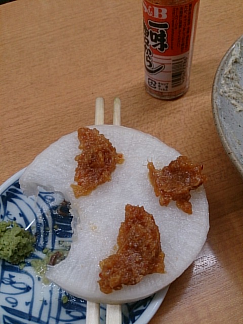 一緒に頼んださば水煮缶が、大げさじゃなく今まで食べたさば缶の中で一番おいしかった。おいしすぎて2つおみやげに買って持って帰ってきたw写真撮らなかったけど、にら玉もすごいおいしかった。マスターが飄々と作り方も教えてくれたしwそしてまた飄々と「大根ありますけど切りますか?」ってマスターが言ってくれて、食べた大根がまたおいしいかった。乗ってるのは味噌です。