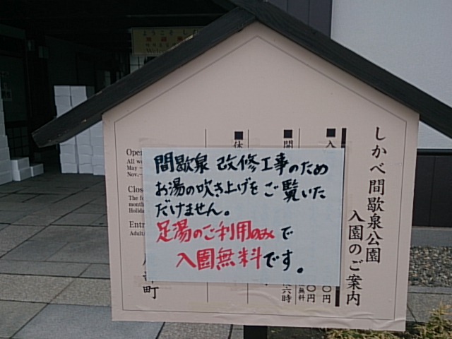 次は鹿部に移動して間欠泉。10分に一度ウワーッてお湯が上がるんだってーってワクワクして着いたら、なんかクレーンとかトラックとかの工事車両があって嫌な予感…。