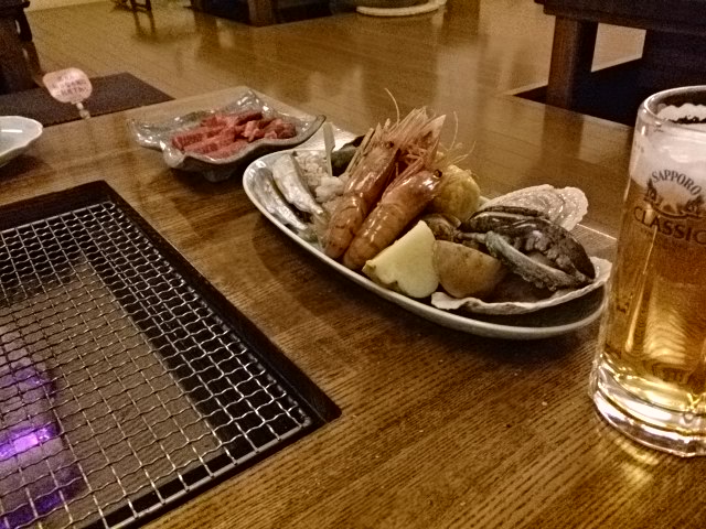 函館開催があった時はほぼ毎年のように泊まっていたけど、その後は足が遠のいちゃってて来たのは約5年ぶり。ここは何と言っても食事が豪華でとてもおいしいのです。新鮮な海鮮物や肉を囲炉裏で自分たちで焼いて食べたり。