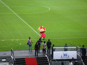 こんなかわいいポーズ取ってるリボンちゃんでしたが、サッカー教室終わった子ども達に「カモォォン!」って手でジェスチャーして、フラフラ寄ってった子どもをムリヤリ羽交い締めにして写真撮ってたのを私らは目撃したぞwしかも撮ったあと手を口に当てて「キシシシシ」みたいなズルい顔して笑ってたw中の人はオッサンに違いない。