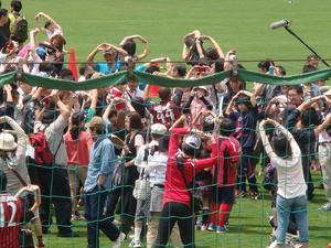目標を達成した後は、見学の時間まで暇なので、ピッチを見ながらいろいろ食べたりして過ごす。開会式が終わって選手が散らばってみんなで準備体操、終わってゲームに出る選手はゲームして、サインの長い行列ができてる選手はひたすらサインと写真撮影をこなして、選手もサポもみんな笑ってて楽しそうだからただボーッと見てるだけでこっちも楽しい。 小野の周りは黒山の人だかり