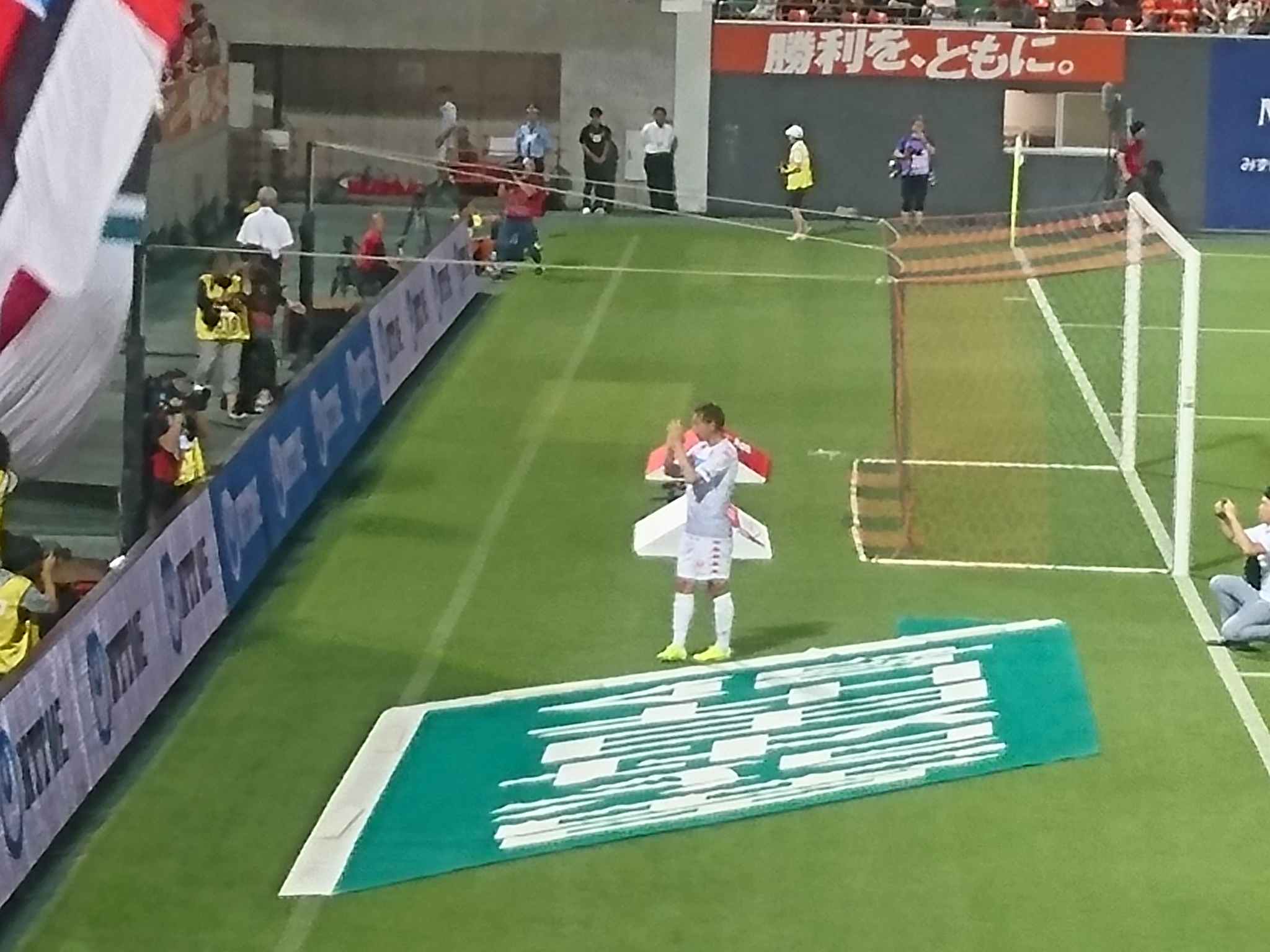 あと後半の見どころは、進藤さんのPK疑惑ですかねw主審の西村さんも最初ビシッとPK判定してたのに、何やかんやで判定取り消しになったっていう。我々も「ああ…PKか」ってあきらめたけど進藤さんが西村さんに「頭に当たったよー」的なこと言ってて。またまたーwとか思ったんだけど、リプレイ見たらシェー!みたいなカッコした進藤さんの頭に当たってたわwシェーの上に上げた手に当たったと思われたんだな。そしてその後すぐに進藤さんがリカルドサントスに近寄ってそっと肩をポンポンと叩く謎の行動してたwなにしてんだ進藤さん。