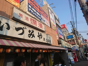 ナクスタへ行く前に、おなじみの店へ直行。レトロな店内の高い窓から日が差して、壁にはメニューの書かれたたくさんの短冊が貼ってあって、せまっちいテーブルにじいさんも若い子もぎゅうぎゅうに詰めて座って飲んで、その間を縫うようにおばちゃん店員がマイペースにゆっくりと歩き回る。試合前に寄ると「もう試合行かなくていいや」と思わさる店、それが「いづみや」である。