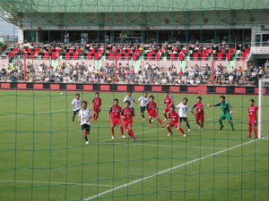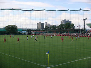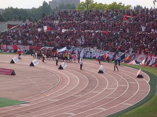 そんなことで昨日は懲りもせずに宮の沢へ、ノルブリッツ北海道との練習試合を見に行って参りました。試合開始直前に到着したら、私のように懲りないキモサポが満載でフイタwいつもは開放してないゴール裏やバックスタンドの一部も開けてたよ。日差しが暑いので私らはバックスタンド側で観戦。