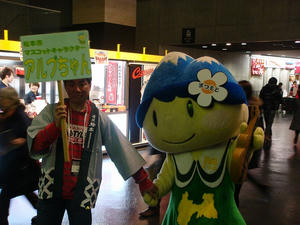 コンコースを歩いていたら、札幌に来てくれてた松本市のマスコットに遭遇しました。「帽子は北アルプス、服は豊かな自然を表す緑色、楽都イメージしたバイオリンを持って、花いっぱい運動の発祥地であることから花の飾りを頭につけたアルプちゃんです」→松本市HPより。