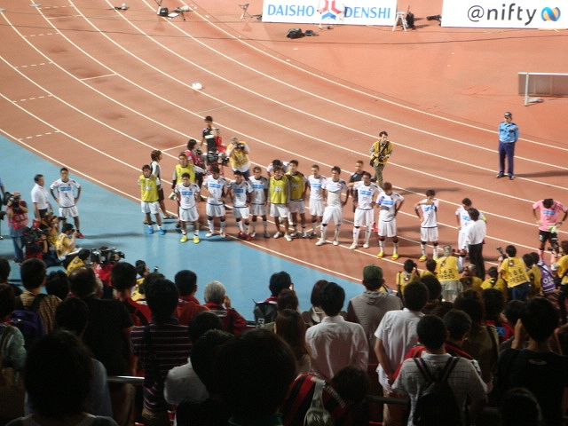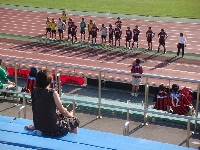 数字に弱いことを理由にハナから勝ち点の計算とかに興味のない私は、当日の朝刊を見て、ウチが今日勝つか、負けても大宮が引き分け以下なら首の皮一枚つながるんだな、程度の知識だった。で、まぁアッサリ負けて、「さぁ飲みに行くべー」って武蔵中原あたりの居酒屋でレプリカ着たまま飲んで酔っぱらってホテル帰って来た。
