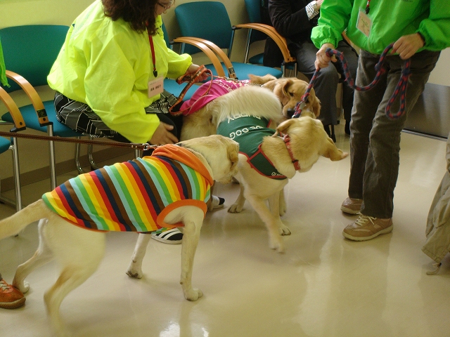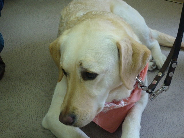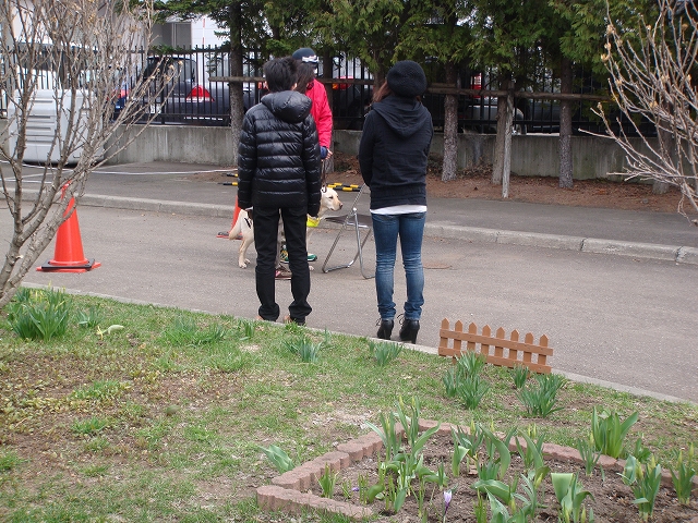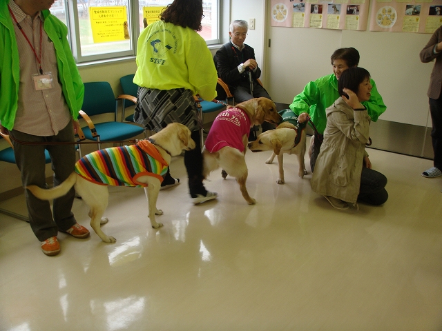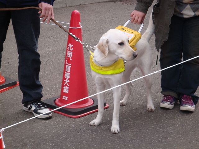 施設の前では、盲導犬歩行体験が行われていました。アイマスクをして歩き、障害物をよけたり、途中置いてあるパイプ椅子の位置を教えてあげたり。「ここが椅子だよ」ってアゴを載っけて教えてあげてた。