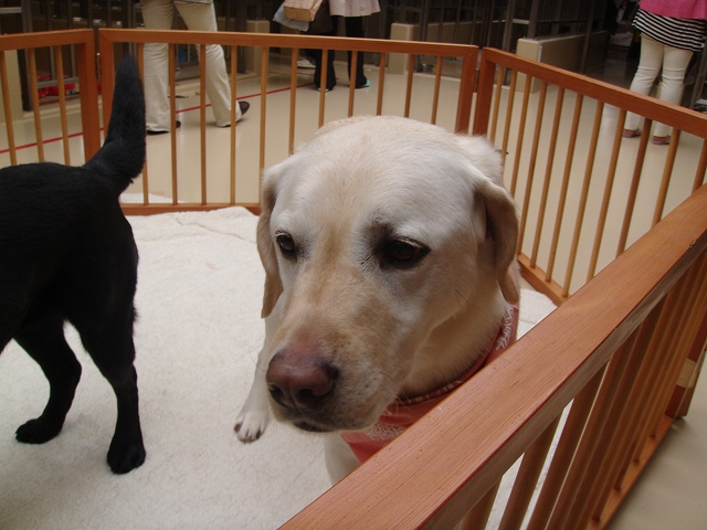 施設の中にあった、「盲導犬ふれあいコーナー」。私らにとってはここが一番の目当てですよ。盲導犬といっても、まだ訓練に入る前のパピーウォーカーさんのところにいる犬たちが待ち構えてました。最初は触らせてくれたんだけど…。
