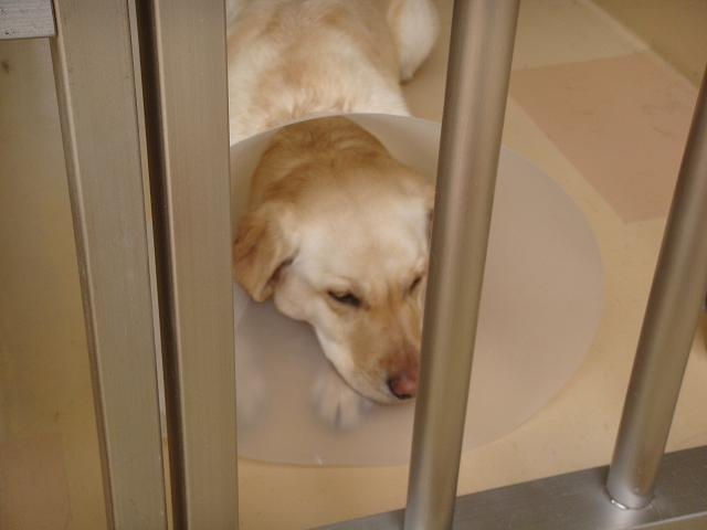 その後は犬舎に向かいます。こちらは繁殖犬や訓練中の犬なので触っちゃいけない場所。怪我してるのかな。エリザベスカラーしてしょぼくれた顔してたw