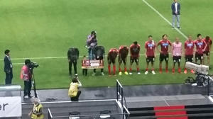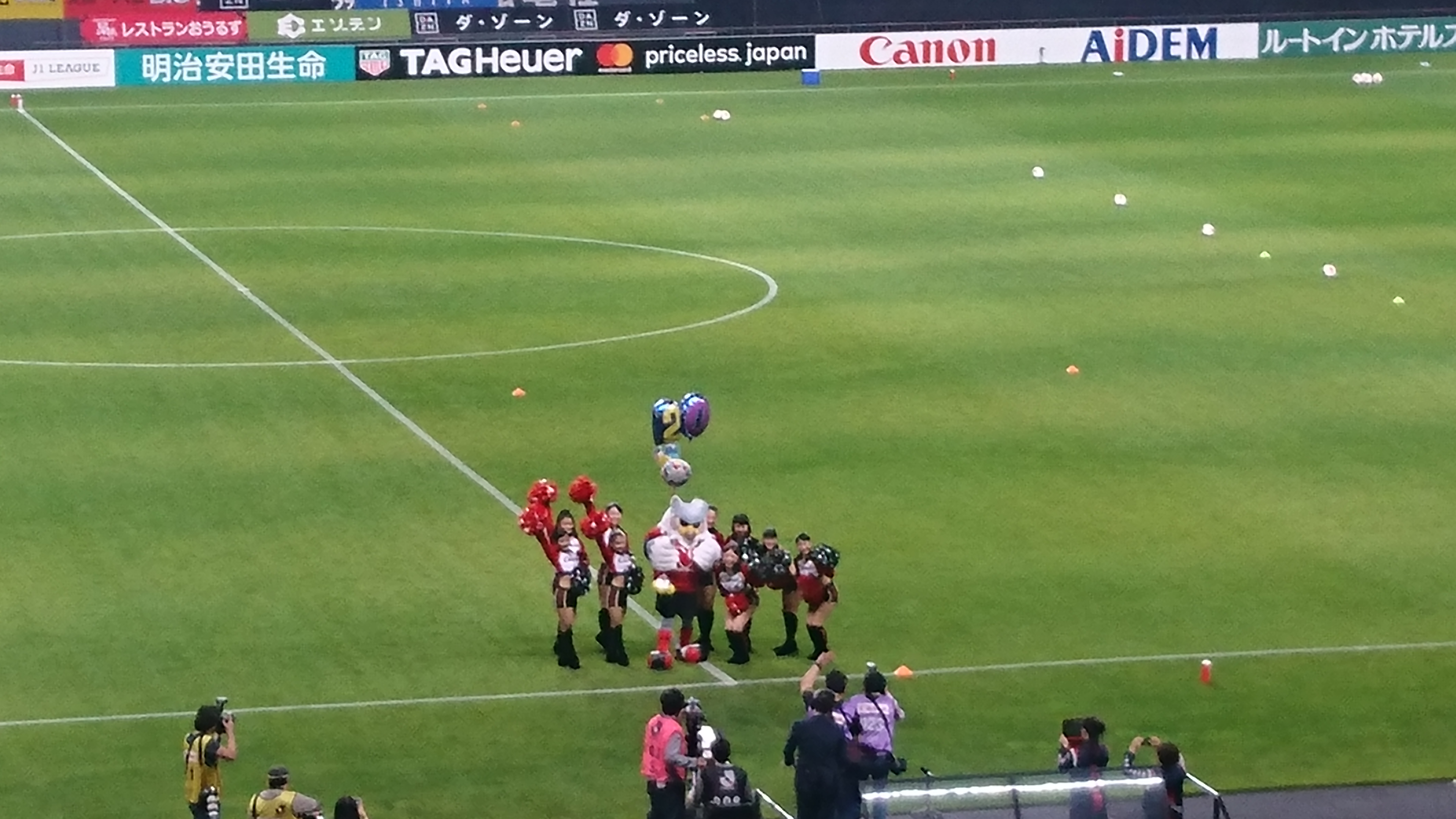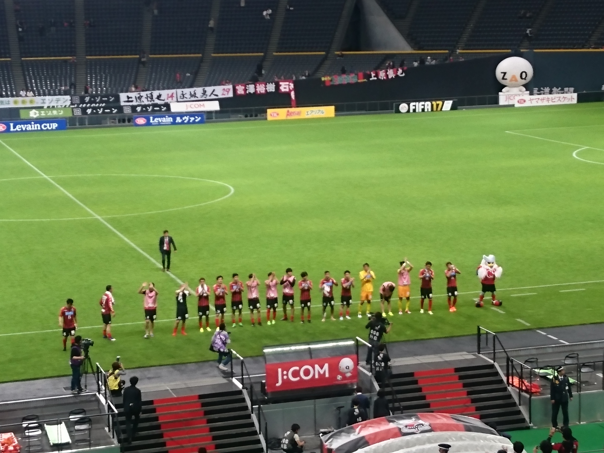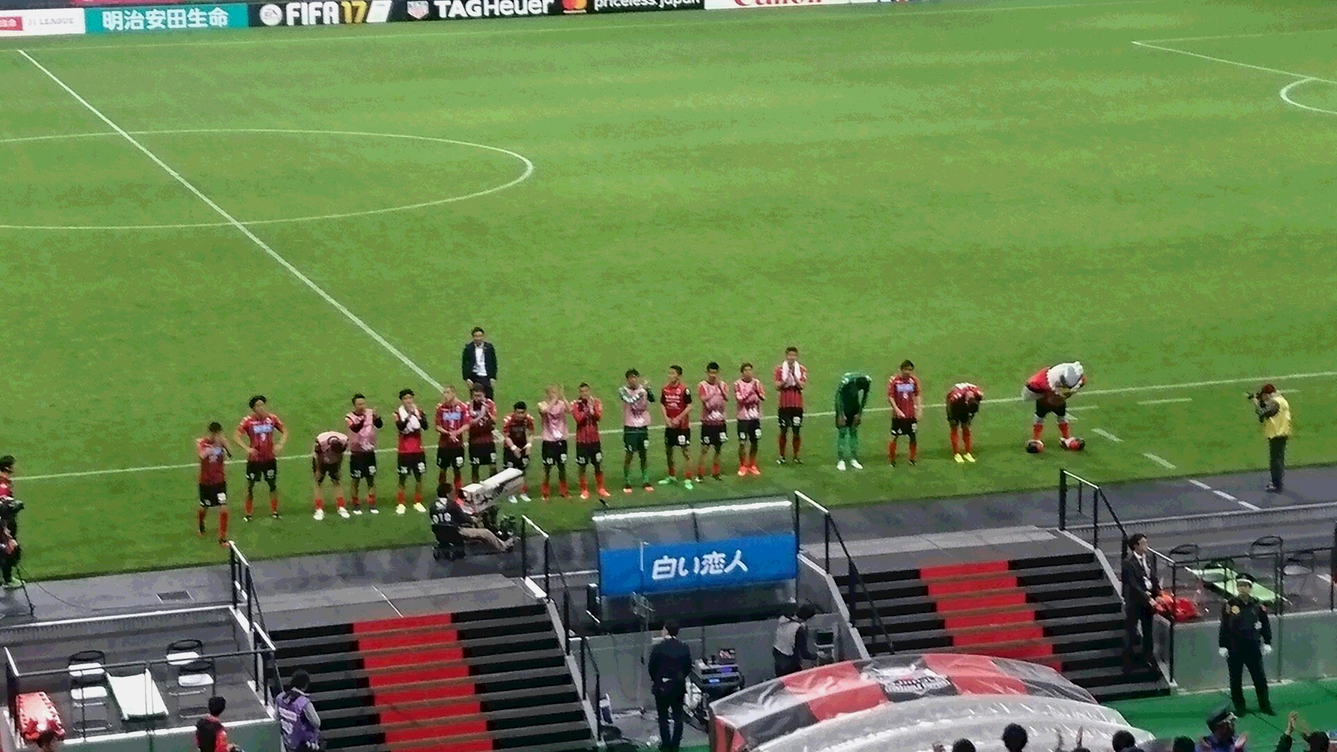 試合終わったらまたヘイスとマセードとマセードJr.がベンチに来てましたね。マセードJr.はゴール裏に挨拶に行く選手をじーっと見てました。早くパパが復帰してまた一緒に挨拶に加われるといいね。そして挨拶から帰ってきた選手たちと並んで、なぜかヘイスとマセードJr.がMVP賞を持ってみんなと一緒にペコリとしてて笑ったw