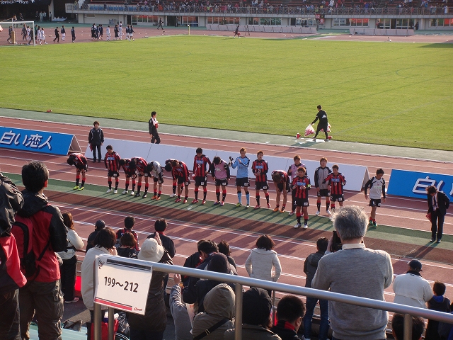 1失点目は相手の何でもないコーナーキックが風の影響で微妙な角度になって、ゴールマウスに吸い込まれるという不運な失点だった。さらにもう1点追加されたんだけど、前半のうちにしっかりサイドから崩して1点返したんだよね(ここの場面は遠くてあんまり見えず)。後半も押し気味に進めてピンチらしいピンチもなく、でも得点もできず…でもう1-2で終わりかと思いきや、またまたサイドからキッチリと崩して得点して(しかも2点とも同じ形だった)、宮の沢が沸きましたよwwwなんかねー失点しても点取れなくてもみんな全然慌てないんだよね。自分たちのできることをしっかりやってこなす。どっかのトップみたくタテポンとかしないし。