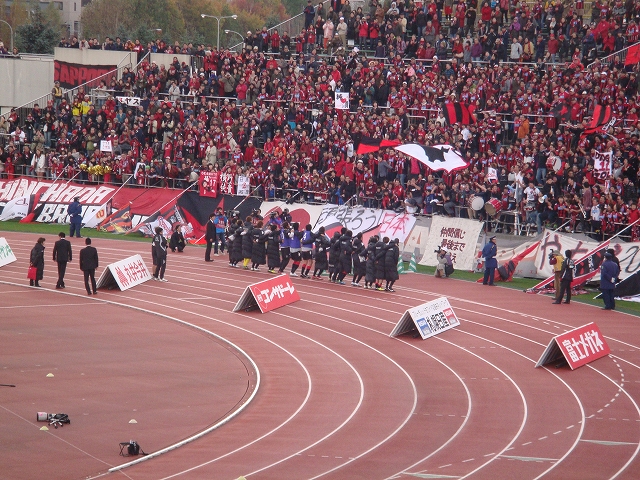 あーやっとみんなが札幌に帰ってきた。短かったようで長かった、アウェー合宿の約1週間。その間にいろいろあった。連敗して気持ちが落ちそうになったけど全員で話し合ってトンネルから抜け出して。遠くの地でたくさんがんばって帰って来たんだねぇ…と考えるだけで涙が出そうになり…。そんなババァ心を全開にして、試合前の選手を見つめていたですよw