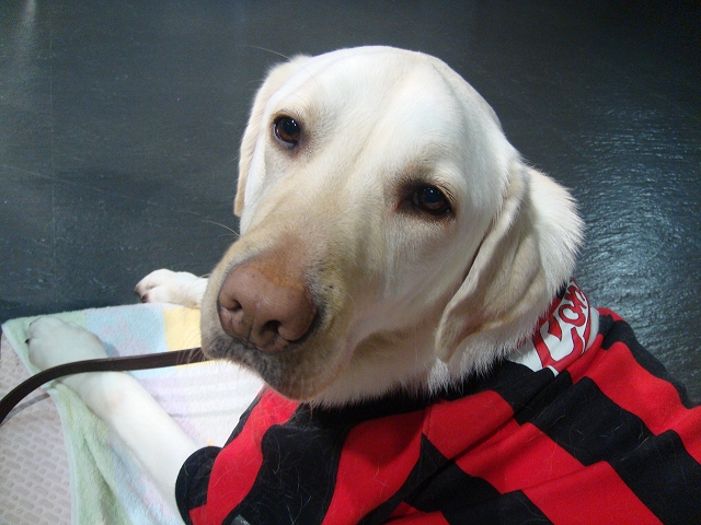 試合前に犬に会いに行ったよ。白いのがアトム号で黒いのはサマー号。アトムは首から肉がはみ出てぶよぶよになってたwww「30キロあるんですよ!ユニホームがきつくて…」(盲導犬協会のお姉さん談)。サマーはお疲れのご様子で反応なしwどっちもめんこくてさぁ。