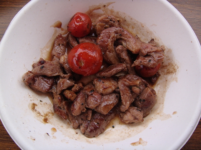 焼き上がるまでに、他の店で買った「士別サフォークラムジンギスカン」を食べる。自分で炭で焼くこともできますが、これは店で焼いてから売ってもらいました。これがねぇ、とてもおいしかったんだわ。もはやジンギスカンじゃないね。高級なお肉って感じ。赤いのは焼きトマトです。