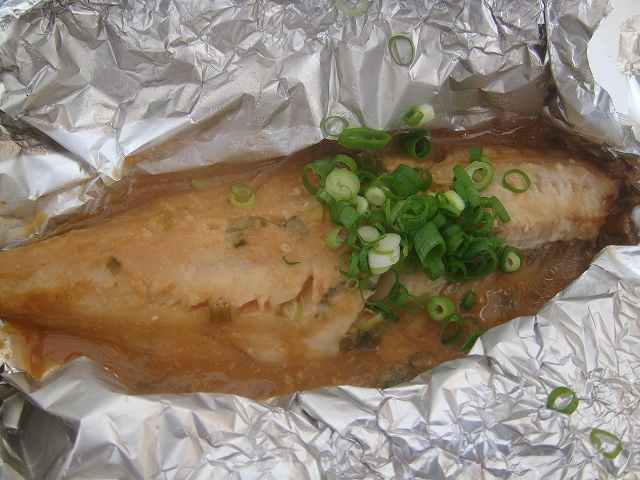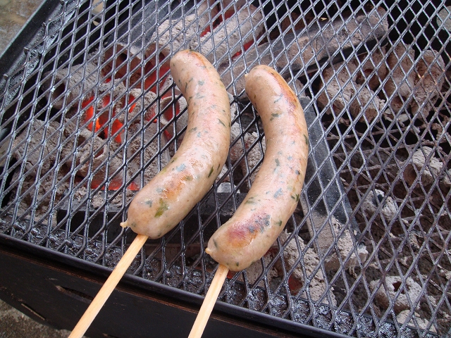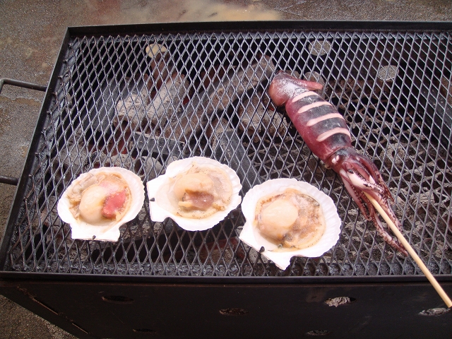 ほたて、いかを焼き、行者ニンニク入りソーセージをあぶる。
