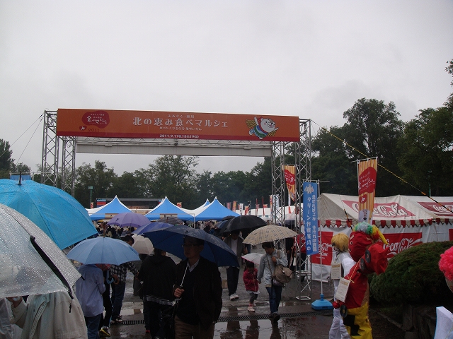 もう前の日曜日の話ですが、札幌市内がオータムフェストでにぎわっている中、私らは足をのばして旭川まで行ってきました。前日の北九州戦の勝利のおかげでウキウキした気持ちで向かった先は、「北の恵み食べマルシェ」です。